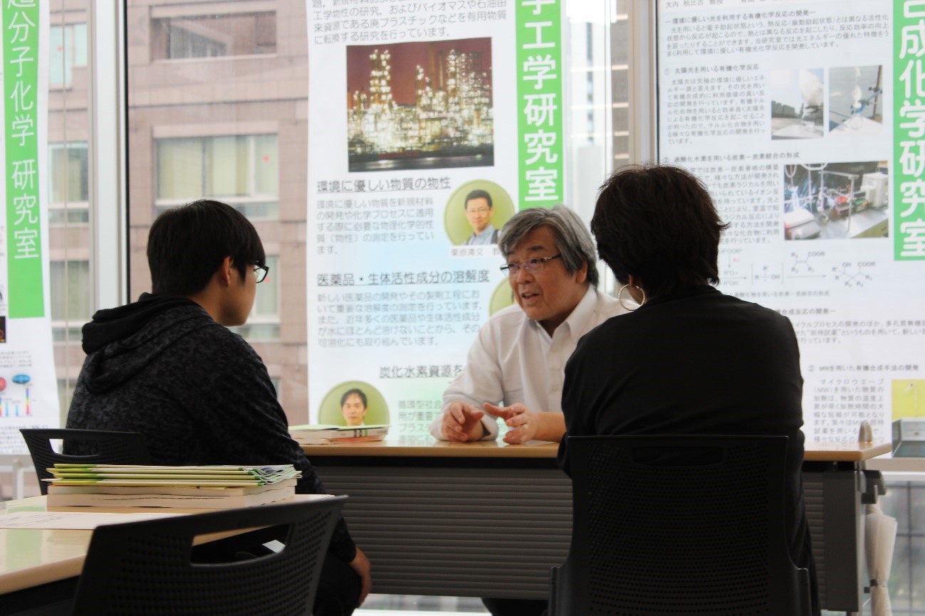 実験器具・機器展示(少しミニ実験も)、研究紹介などの物質応用化学科ブースに多くの方にご参加頂きました。
